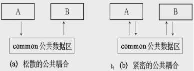 外部耦合:一组模块都访问同一全局变量而不是同一全部数据结构,而且不是通过参数表传递该全局变量的信息。(连接外部环境)