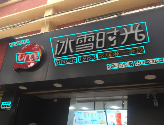 可以看到经过上面的两项改进后,EAST确实对于不同尺度文本以及倾斜文本都检测较好。“SINCE”“1983”“冰淇淋”也被分开定位了,解决了CTPN无法解决的问题。