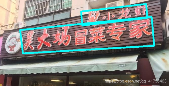 CTPN网络由于使用了双向BLSTM(如图2-1所示),网络感受野较大,所以对于横向的长文本可以进行准确的定位检测,所以如图2-2所示,我们首先使用CTPN对商铺招牌中的长文本进行检测,定位出文本大框。