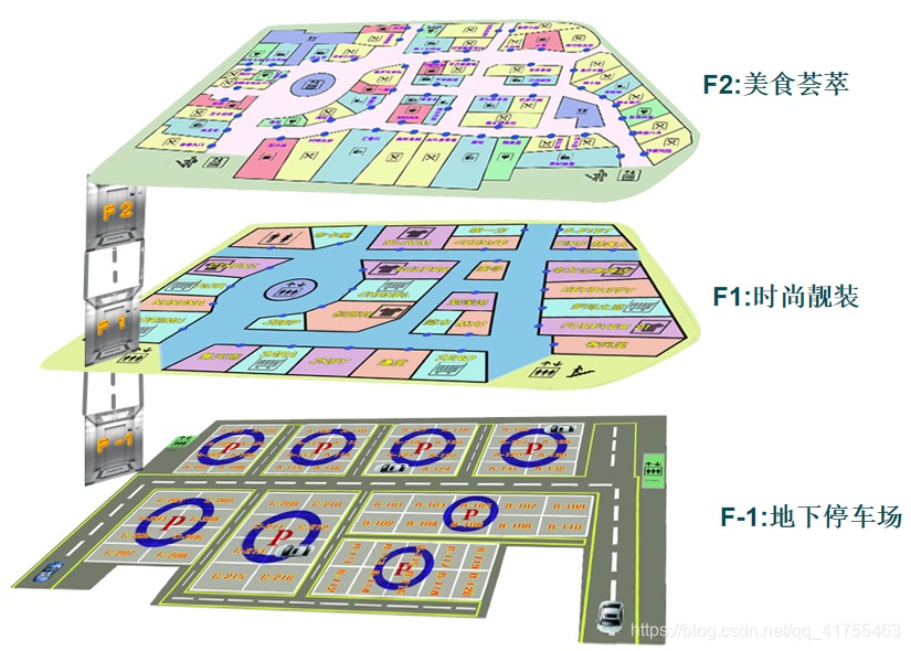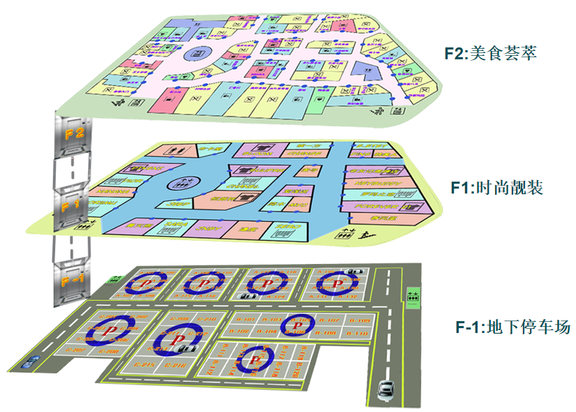 首先建立3层商场模型,F-1为商场地下停车场、F1为商场服装区、F2为商场餐饮区。商城模型如图3-1所示。