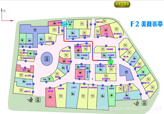 在确定用户所在的起始点和目的地之后,系统可根据商场的平面图进行路经规划,给出用户合适的行走路线,进行导航。相比于室外复杂的路况,长距离的导航,室内商场地形相对简单。因此我们使用经典的A星算法,使用其中的8向寻路,以及进行路线平滑操作,最终实现路经规划。A星算法在搜索精度和速度方面进行了很好的平衡,可以满足商场室内导航的需求。