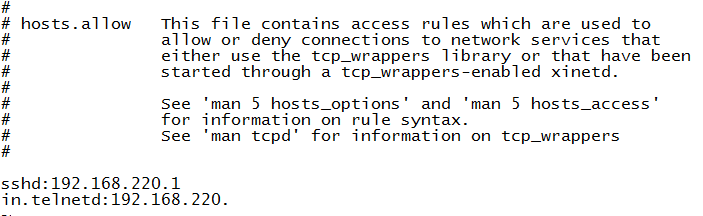 以ssh允许192.168.220.1和telnet允许192.168.220网段为例,具体在/etc/hosts.allow加入内容如下: