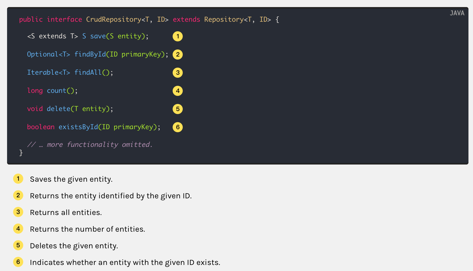 { Optional<T> findById(ID id); <S extends T> S save(S entity); }