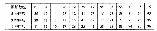 希尔排序有时也被叫做缩减增量排序,有一个增量序列来逐步排序。例如下面的例子,先进行间隔5排序,即81、35、41三个数。然后进行3排序,最后进行1排序,逐步地完成排序。