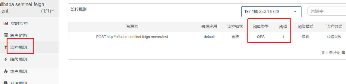 设置 流控方式为 QPS 阀值设置为1 (查询大于1则降级)