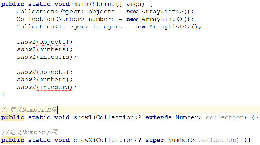 此时可以看出,对于上限为 Number 的集合,Object 就不能作为参数传入;对于下限为 Number 的集合,Integer 就不能作为参数传入。通过通配符的上下限,我们在编写程序时就自动过滤了不想要的参数类型。