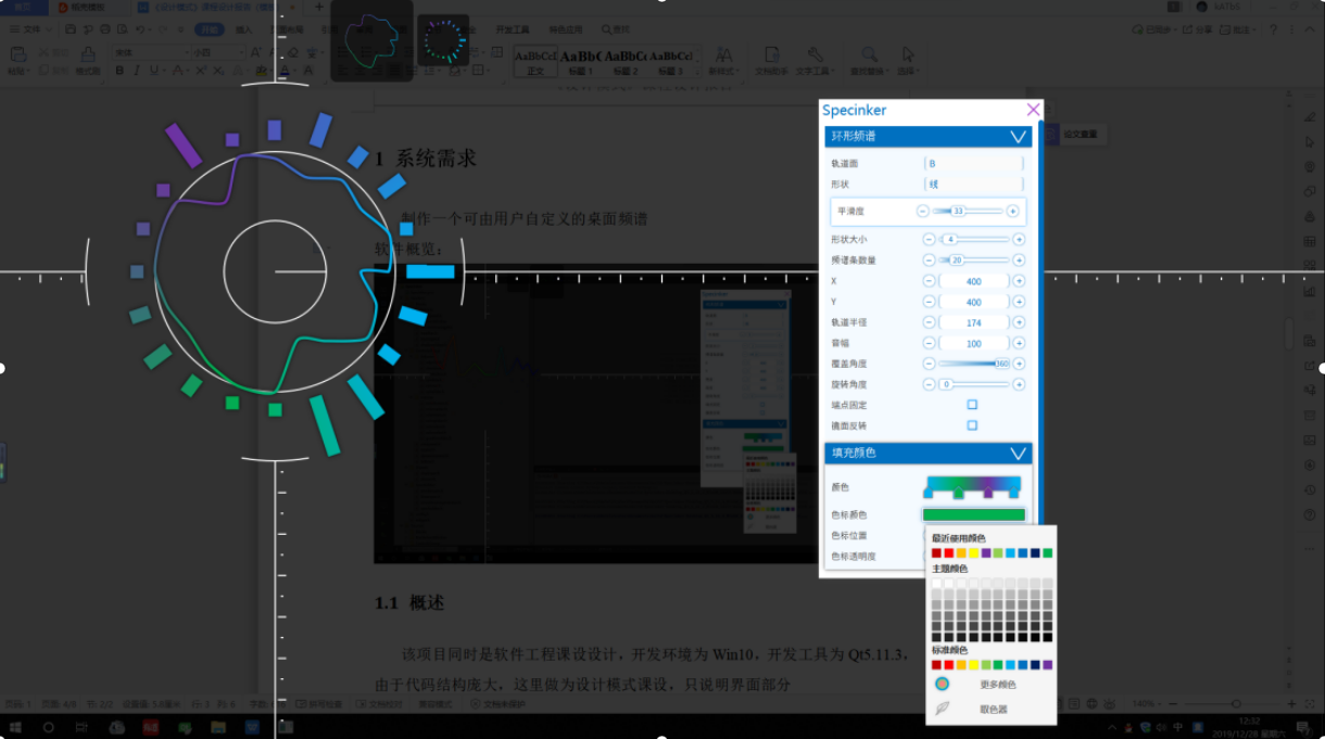 由于这个团队就我一人,且代码工程量不小,既要做UI,也要搞引擎,还得做ppt,初次的设计界面是随手画的,比较普普通通的常规设计软件,一个缩率窗口,然后窗口旁边一些属性,这样做也还行,后来我突然这样想到,既然我做的是桌面频谱,我为什么还要费事费力的搞一个缩率窗口来进行设计,直接在桌面设计,所见即所得不行吗?因为这个东西,我考虑到肯定要花费很多时间,所以歌单管理界面写了一半,干脆直接不要播放器了,直接采集系统音频,况且做播放器真的太没意思了(主要原因还是我找到了采集系统声音的方法)