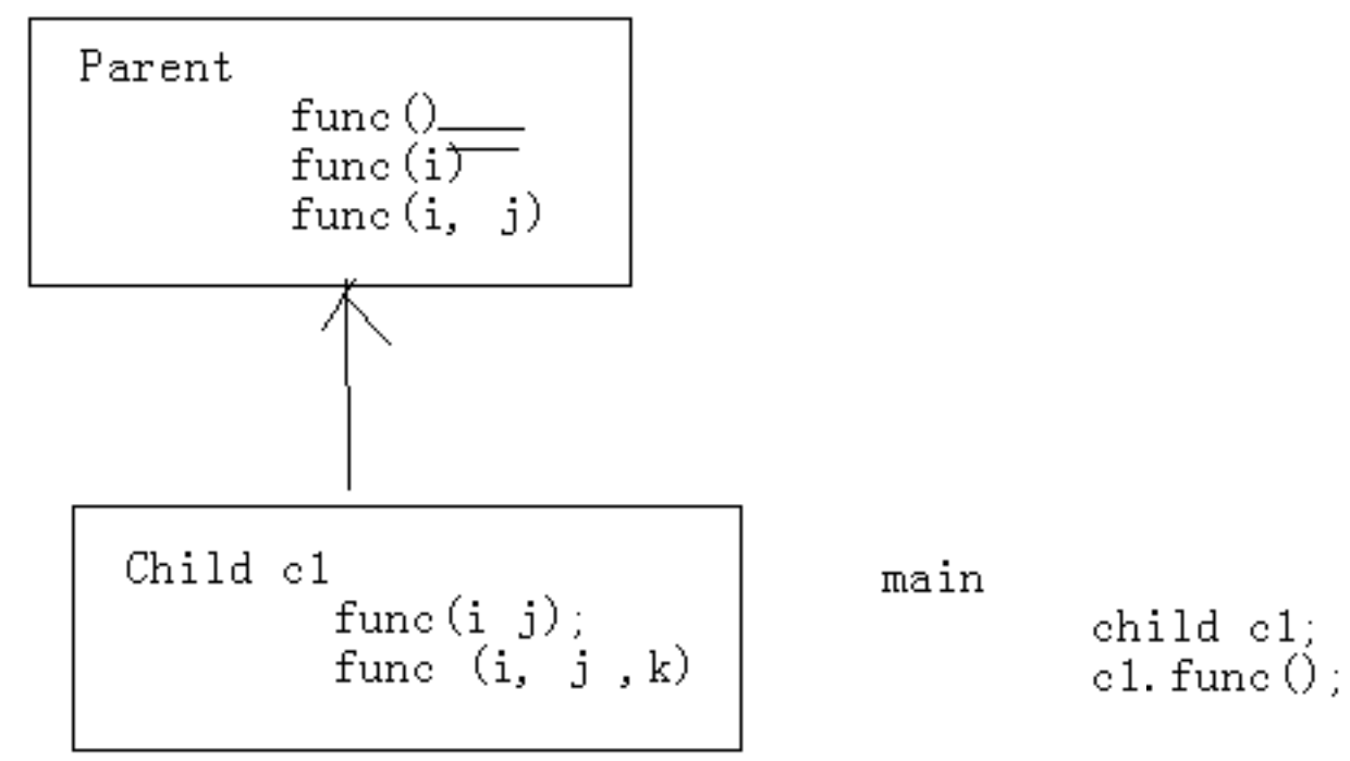 //2 c++编译器只会在子类中,查找func函数,找到了两个func,一个是2个参数的,一个是3个参数的.