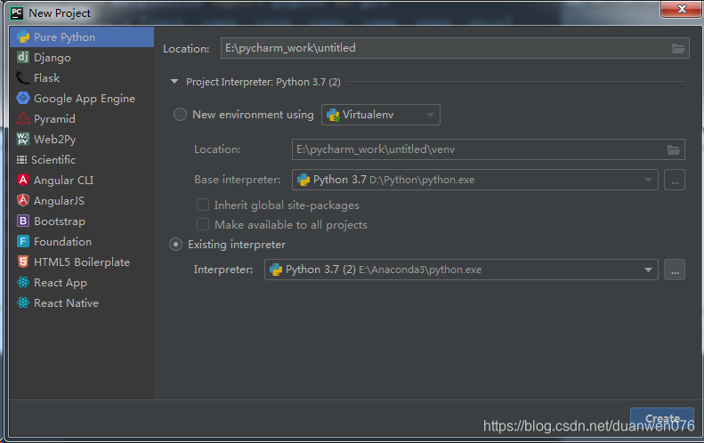 打开pycharm,new project,选择项目存放位置后,选择project Interpreter(一定一定要选Existing interpreter)。选择anaconda3目录下