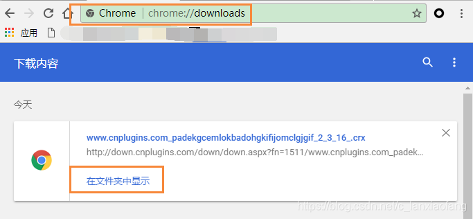 1、找到下载好的 .crx 文件所在文件夹(可以在Chrome 浏览器输入:chrome://downloads/ )