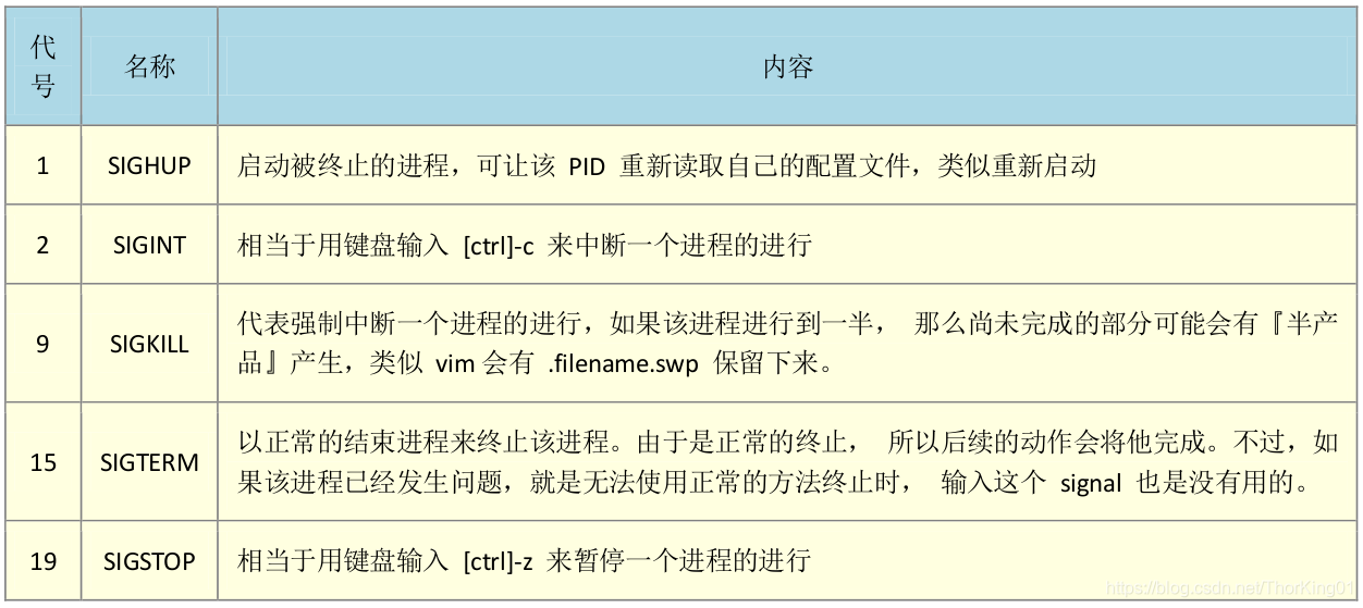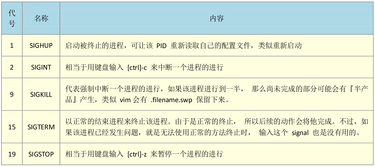 -signal:-1表示重新读取一次参数的配置文件 -SIGHUP;-2表示由键盘输入ctrl+c同样的操作;-9表示强制删除一个任务 -SIGKILL;-15表示以正常的方式终止任务与-9时不同的 -SIGTERM;