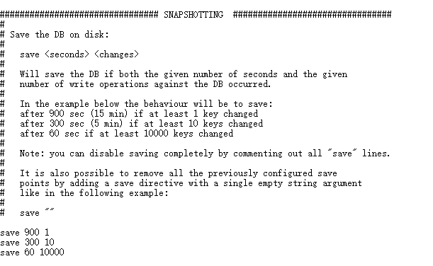 该配置是用户自定义其快照条件,规则:时间窗口M 和 改动键的个数N 即当在M的时间段内更改键的个数大于N,即为符合自动快照的条件,如: save 900 1