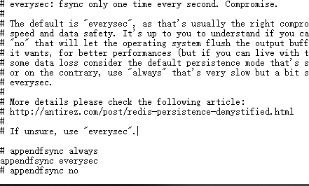 每次执行更改数据库内容的操作时,AOF都会将命令记录在AOF文件中,但事实上,由于操作系统的缓存机制,数据并没有真正的写入硬盘,而是进入了系统硬盘缓存,系统每30s会执行一次同步,这期间如果系统异常会导致数据丢失,一般来说启用AOF不能容忍这样的损失,所以在redis写入aof文件后会主动要求系统将缓存内容同步到硬盘,我们在redis中可以这样设置: