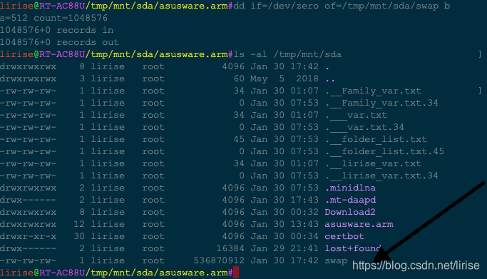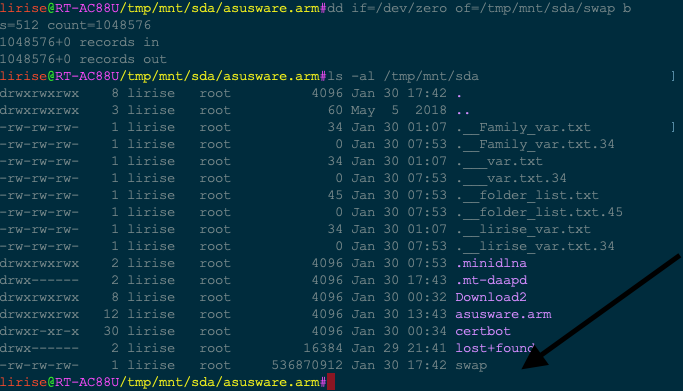 查看一下ls -al /tmp/mnt/sda 可以看到swap文件已经创建好了。