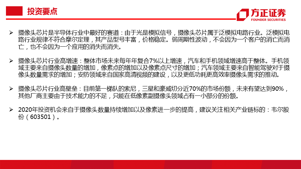 2、深壁垒:CMOS图像传感器=模拟电路+数字电路,需要一家公司同时掌握两种芯片设计能力,具备可积累的护城河。