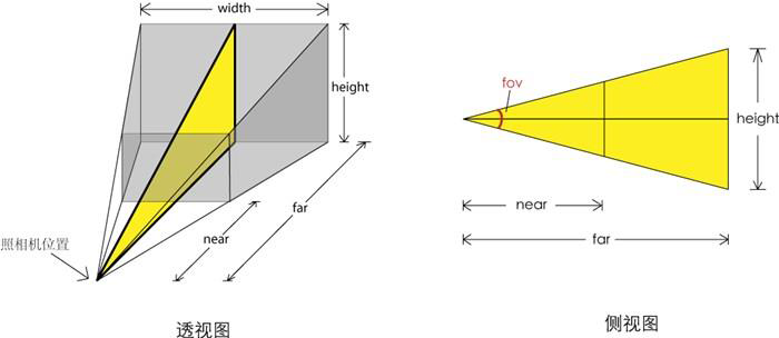 透视投影相机:THREE.PerspectiveCamera(fov, aspect, near, far),遵循近大远小的空间规则