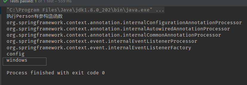 然后再测试类上面输出所有注入的bean,由于系统运行是windows环境,所以windows的bean被注入,而linux没有
