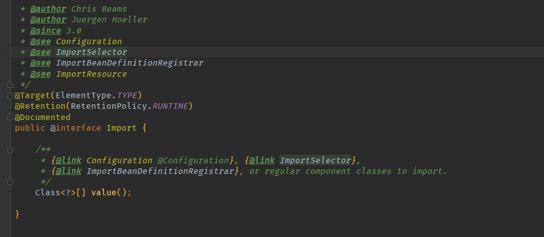 2 使用@import注解快速给容器导入一个组件,观察import源码可知,该注解在spring3.0就有了,并且还可以link# ImportSelector:返回需要导入的组件的全类名数组;以及 ImportBeanDefinitionRegistrar:手动注册bean到容器中