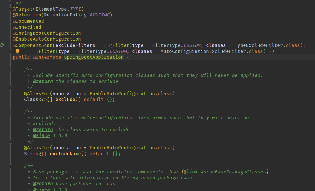 会看到里面有3个注解,一个是@ComponentScan的自定义过滤条件的扫包注入容器,该注解在本人该系列第二篇博客中完整的详细的解释到了,这里就不做过多的解释。spring5学习系列之------2 给容器注册组件二 @ComponentScan 自定义扫描规则,过滤组件,接下来看第二个注解 @SpringBootConfiguration接着点进去