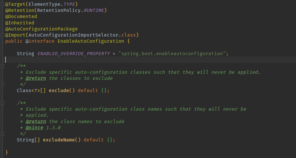 这是对 @Configuration注解的进行封装,在看一个注解是 @EnableAutoConfiguration ,打开这个注解的源码可看到