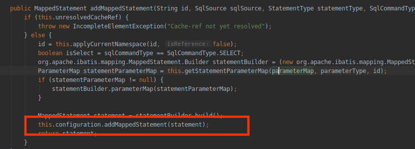 首先Mybatis要加载mapper下的所有insert、select、update、delete标签,并且封装成一个个MappedStatement对象,保存在Configuration下的Map<String, MappedStatement>中,具体实现在 XMLStatementBuilder#parseStatementNode() 和 MapperBuilderAssistant#addMappedStatement() 的方法中(addMappedStatement参数不多,也就20个),其中 this.configuration.addMappedStatement()就是保存在Configuration配置类中