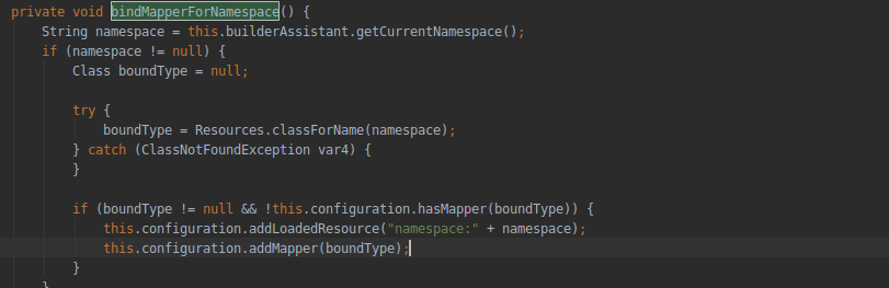 还有之后在XMLMapperBuilder#bindMapperForNamespace() 保存mapper的namespace,存放在Configuration的mapperRegistry字段中的knownMappers下。knownMapper是一个map,key为namespace,value为MapperProxyFactory对象。