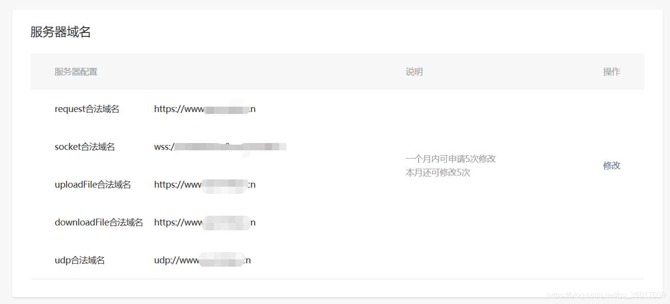 微信公众平台小程序-开发-开发设置-服务器域名,将刚才配置的域名粘贴进去即可,socket为自动生成,一般用不到无需更改。