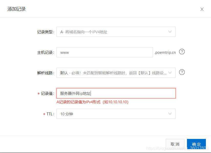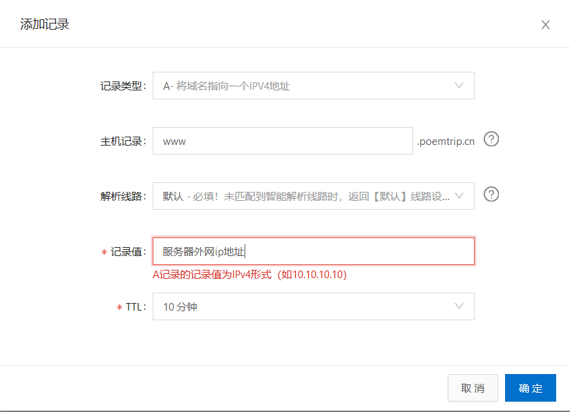 4.2.1.2、选择控制台中的“云解析DNS”选择A类将域名解析至个人服务器的外网IPv4地址,TTL设置为10分钟(TTL相关知识详见参考文档 域名解析TTL是什么意思 TTL值设置为多少合适?)。