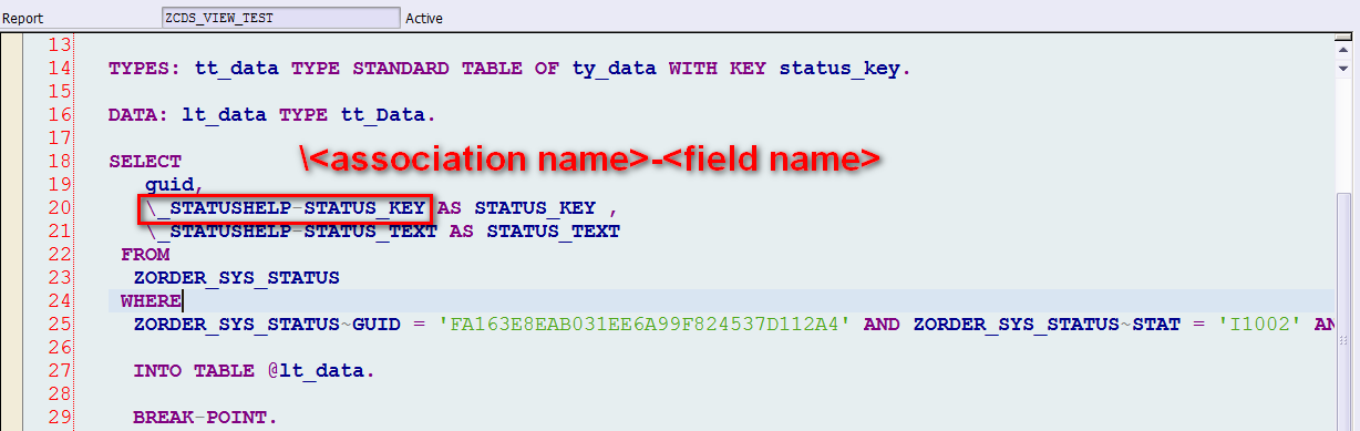 I would like to read the guid from host view Zorder_Sys_Status together with its associated data via association _statushelp.