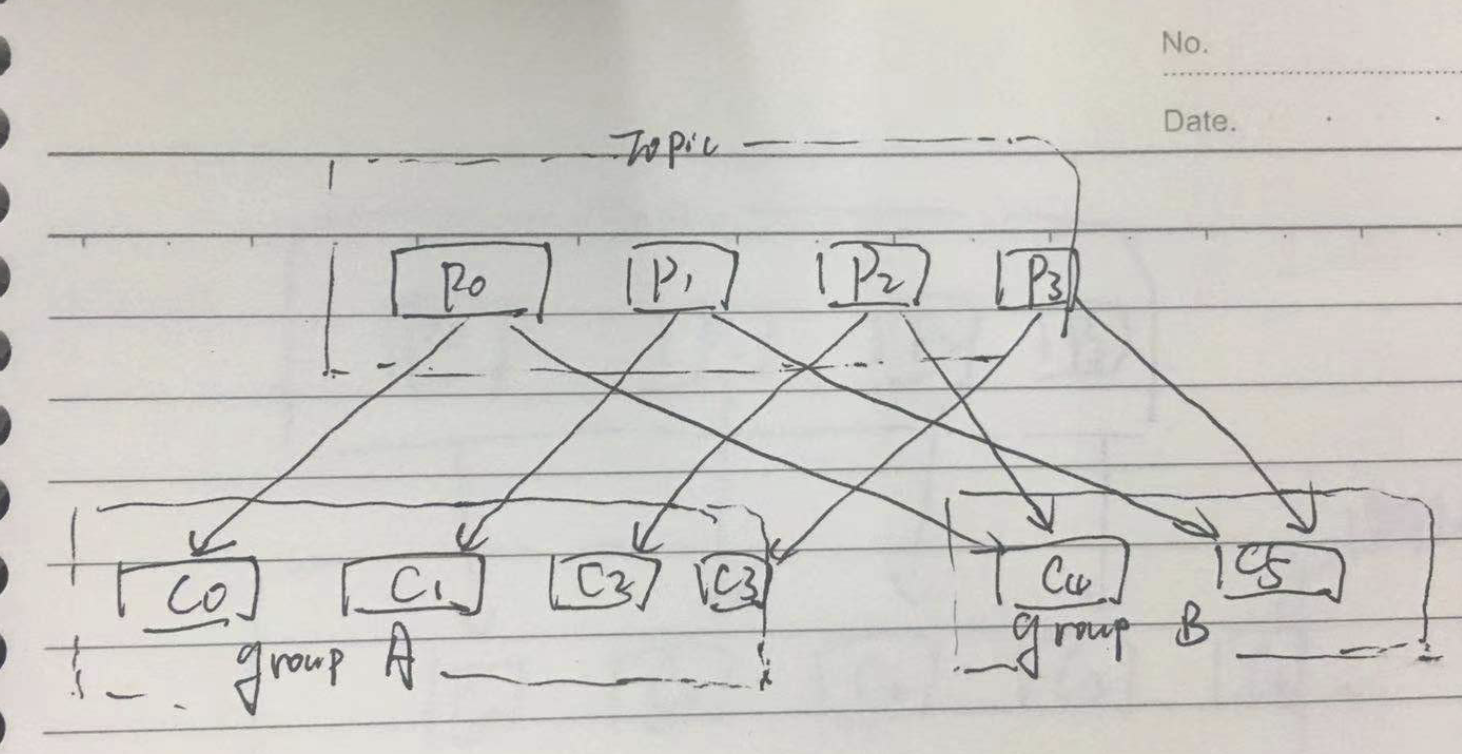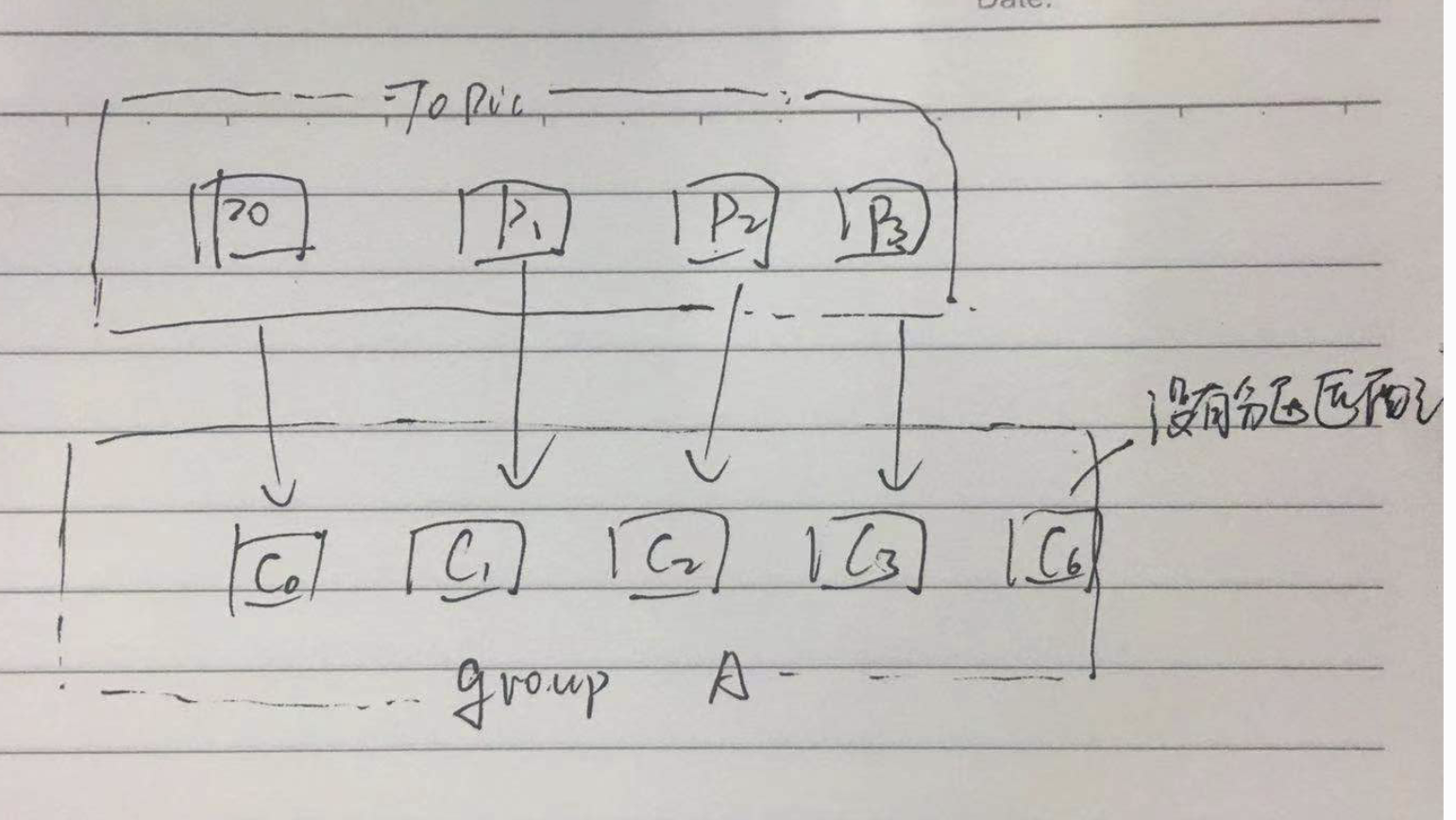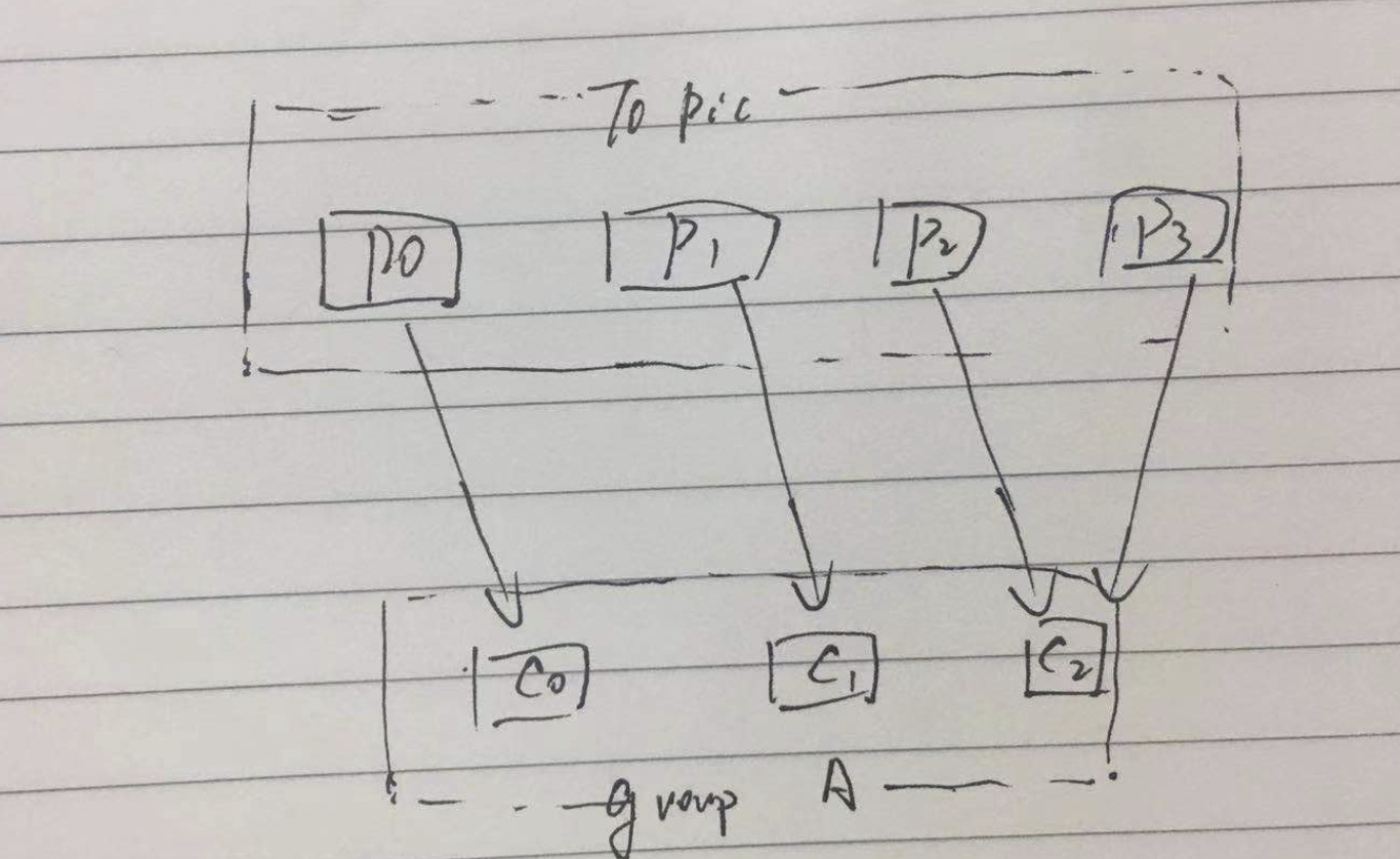例如某个主题下有4个分区:P0,P1,P2,P3,有两个消费组A group和B group 都订阅了这个主题;消费组A中有4个消费者(C0,C1,C2,C3),消费组B中有两个消费者(C4,C5);按照kafka默认的分配规则,主题下的每个分区只能被同一个消费组中的一个消费组所消费,最终的分配结果将是A中的每个消费者分配到一个分区,B中的每个消费者分配到两个分区;如下图: