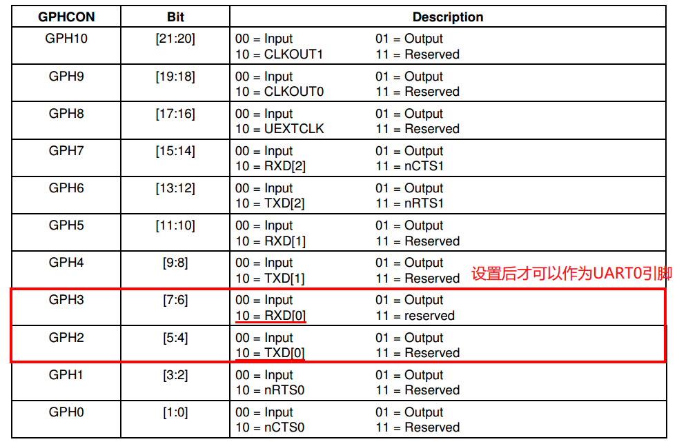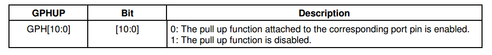 2. 看芯片手册设置引脚复用功能(GPHCON)、开启片内上拉(GPHUP)