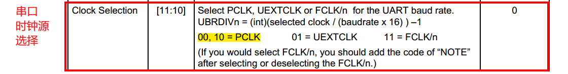 之前在【【S3C2440⑤】S3C2440时钟体系】中进行实验设置了时钟PCLK=50Mhz,所以在此基础上选择PCLK作为串口UART0的波特率发生器的时钟来源: