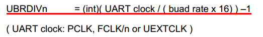 波特率由UBRDIVn寄存器决定,这个寄存器的值该取多少呢?公式如下: