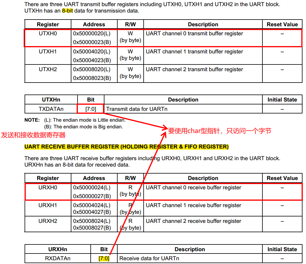 其中最重要的是,在使用指针访问这个寄存器的时候,不能使用int型指针,因为int型指针访问的是4个字节的数据,而此处只能访问一个字节数据,所以要使用char型指针: