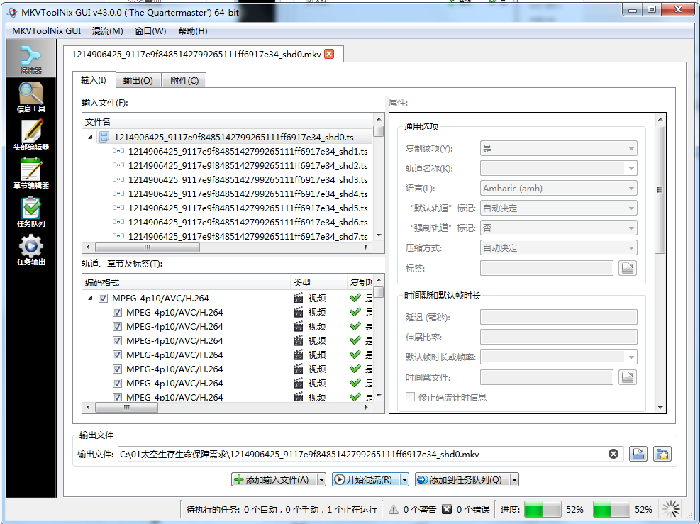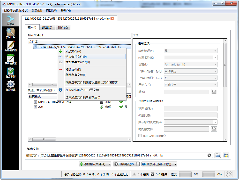 方法二:使用mkvtoolnix-64-bit-43.0.0-setup.exe,讲全部的ts追加合并为MKV文件也可以的。(音画同步好!)