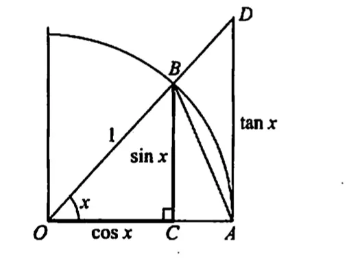我们假设夹角∠AOB=x,这里采用弧度制。我们令圆心OB的长度等于1,那么BC=sinx,OC=cosx,AD=tanx。我们下面要用这张图里的几何图形的面积关系,显然: