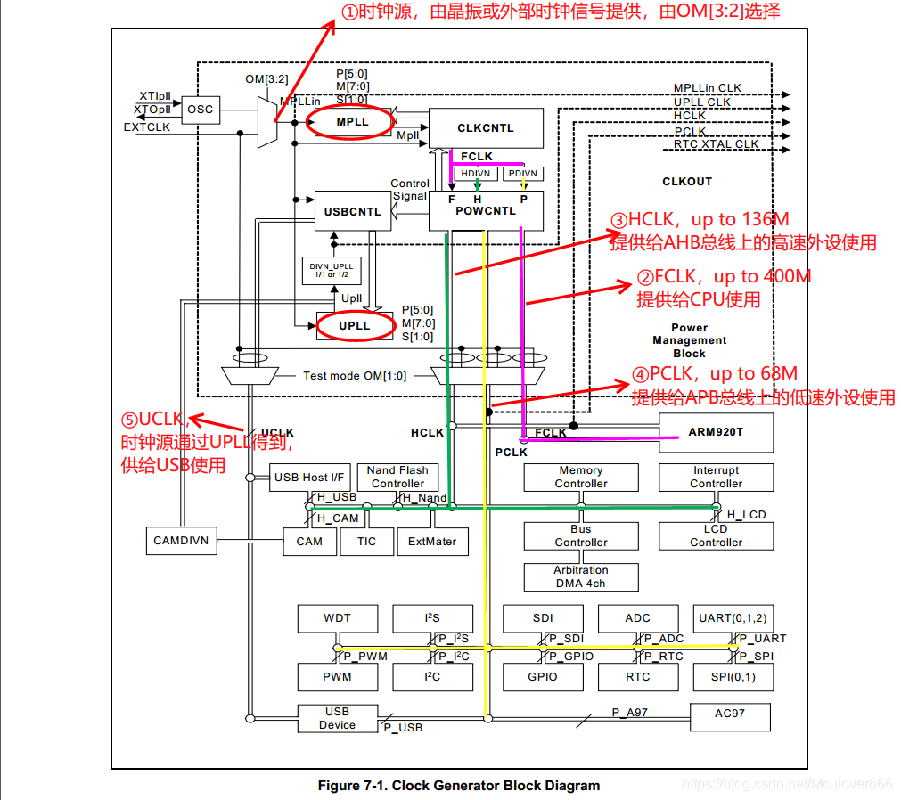 OM[3:2]硬件选择,其内部主要调整频率的PLL有两个:MPLL(产生FCLK)和UPLL(产生UCLK),其主要的时钟频率有三个(FCLK->CPU使用,HCLK->AHB总线高速外设使用,PCLK->APB总线低速外设使用),其中HCLK和PCLK由FCLK分频而来; - 在芯片操作上:掌握了如何编程设置寄存器控制S3C2440的时钟频率(比如本节设置FCLK=400Mhz,HCLK=100Mhz,PCLK=50Mhz)。