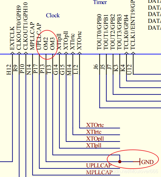 选择哪一路作为S3C2440的时钟源由模式控制引脚OM3和OM2引脚(的电平)决定,如何选择见下图: