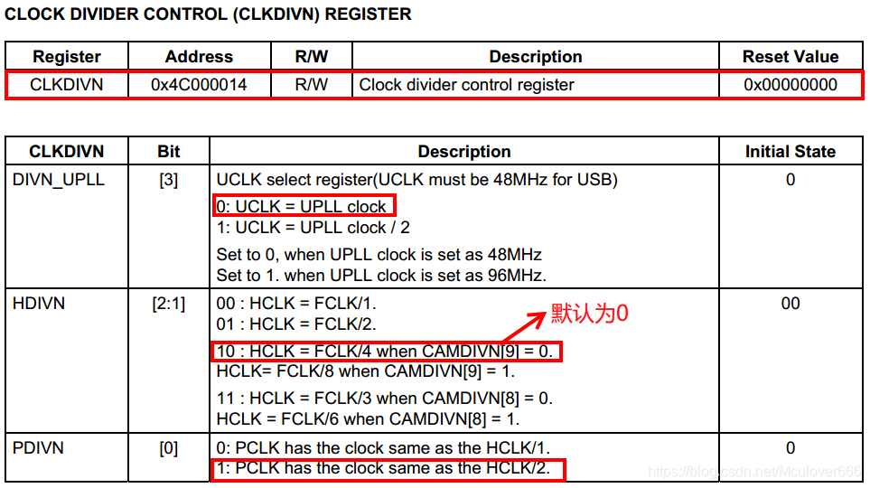 - 设置分频系数(UCLK=UPLL(默认值)、HCLK = FCLK/4(100M)、PCLK=HCLK/2(50M))