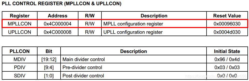 注:MPLLCON寄存器的值可以由公式自己推算,但芯片手册中推荐直接查找推荐表获得: