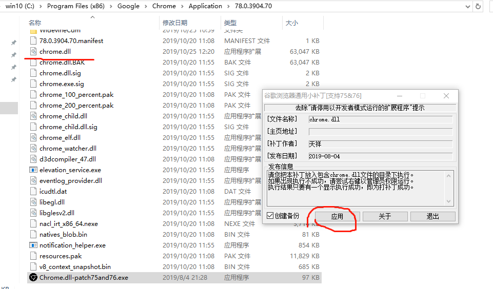 解决方案:使用补丁解决,将补丁放入包含chrome.dll文件的目录下执行。如果出现执行不成功,请尝试右键以管理员权限运行。执行结果只要有一个显示执行成功,即为打补丁成功。经测试,谷歌浏览器78.0.3904.70(正式版本) (64 位)可以成功禁用这个弹窗!