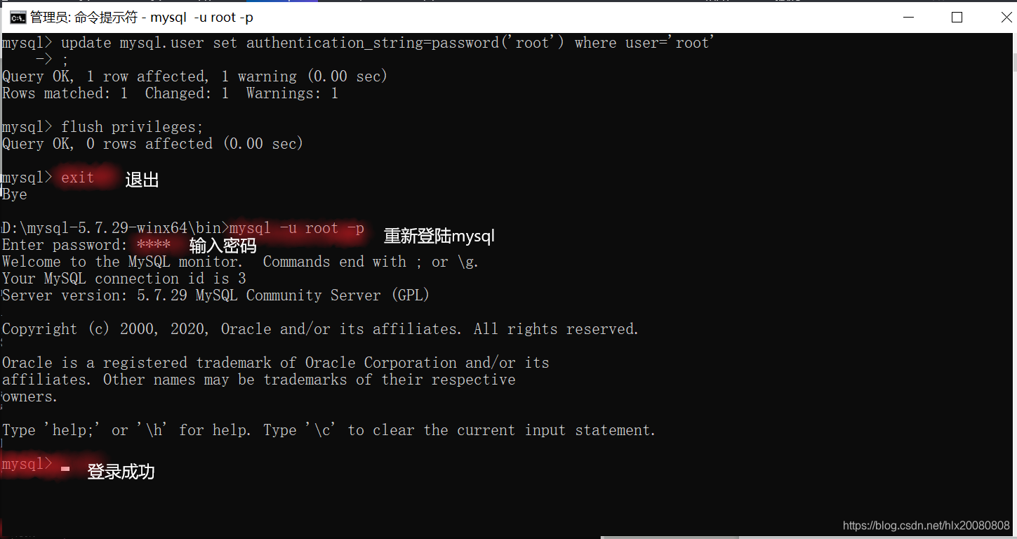 g) 退出,重新登录 mysql -u root -p 输入密码