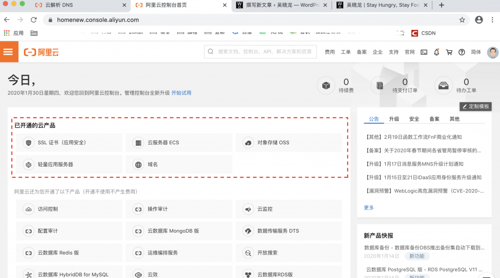 在阿里云上买相关的服务器和域名需要先注册阿里云的账号,登陆账号后,进入控制台,就可以看到自己买的产品了;如果没有开通任何产品,需要现在阿里云买轻量应用服务器;我买的阿里云的产品比较多,所以显示的比较多。