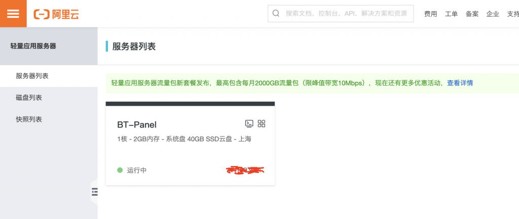在阿里云上买了阿里云的轻量级服务器。大家也可以使用其他的商业云。如果有自己的公网服务器,也可以。