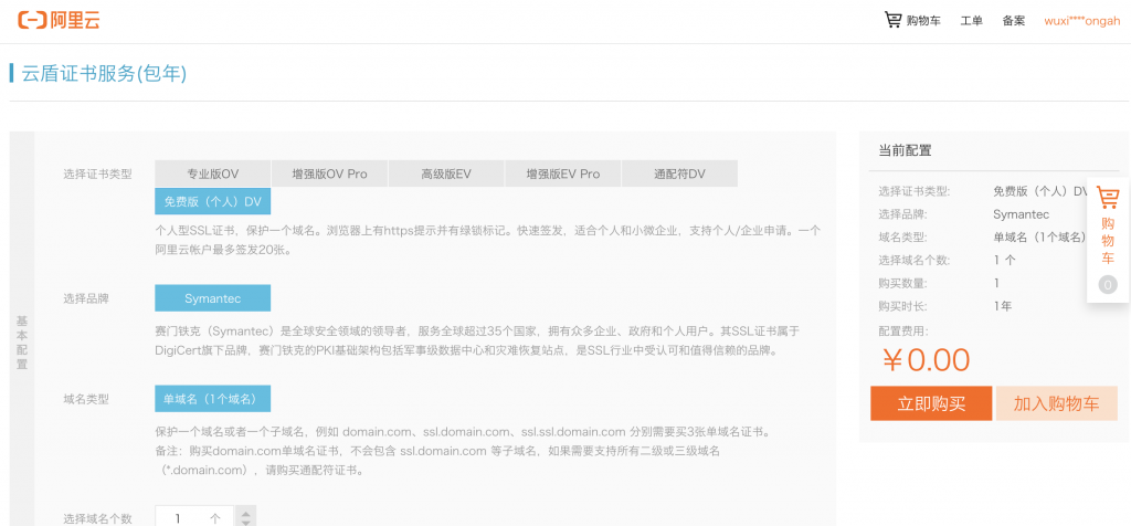 如果使用域名访问,为了网站完全,还需要为域名申请证书,我使用的是阿里云的免费证书,如果有需要还可以购买阿里云的证书。购买地址:https://s.click.taobao.com/t?e=m%3D2%26s%3DX710PAGqnsQcQipKwQzePCperVdZeJviEViQ0P1Vf2kguMN8XjClAoIUDcnJ3GxcSKX47IkeWDViWqKDbmFKuxFi2SvN%2FDeNPEcaNzNMDiGaZwMDXF7hkJSlbT3pBXPWYMsSHLWchUVtQl8vLdysepHjKlMEkHC06du04PdR3Oc9XUfbPSJC%2F02QpUwcKVbRN2UOKVkcRuNXxEY72iEjRQ%3D%3D ;也可以在这里购买买个人免费证书。