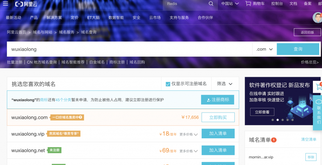 同样需要购买域名,当然这个不是强制的,也可以使用IP;网上也有一些免费申请域名使用;我同样是在阿里云上买的域名,域名很便宜;