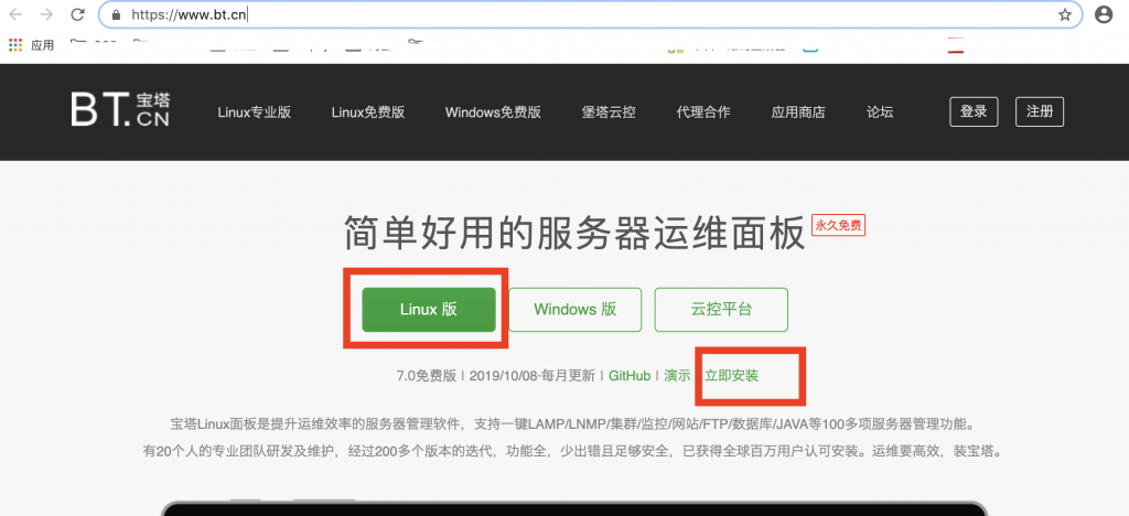 因为我们的轻量级服务器是centos7的,所以我们选择宝塔也是Linux的,我们使用免费的。