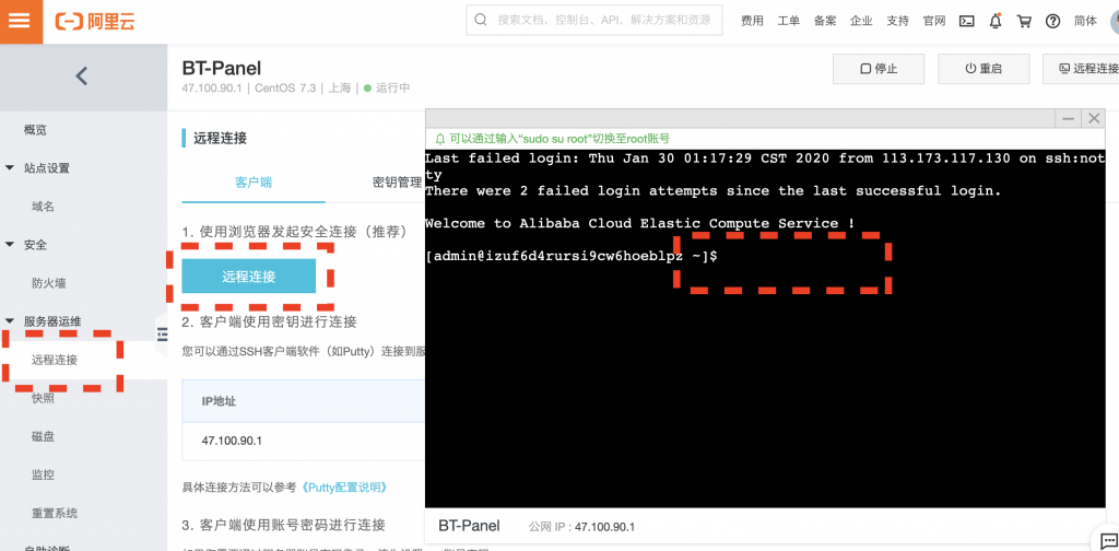 通过阿里云的轻量级服务器实例的命令行管理界面,输入这条命令,等待,即可安装好宝塔面板;