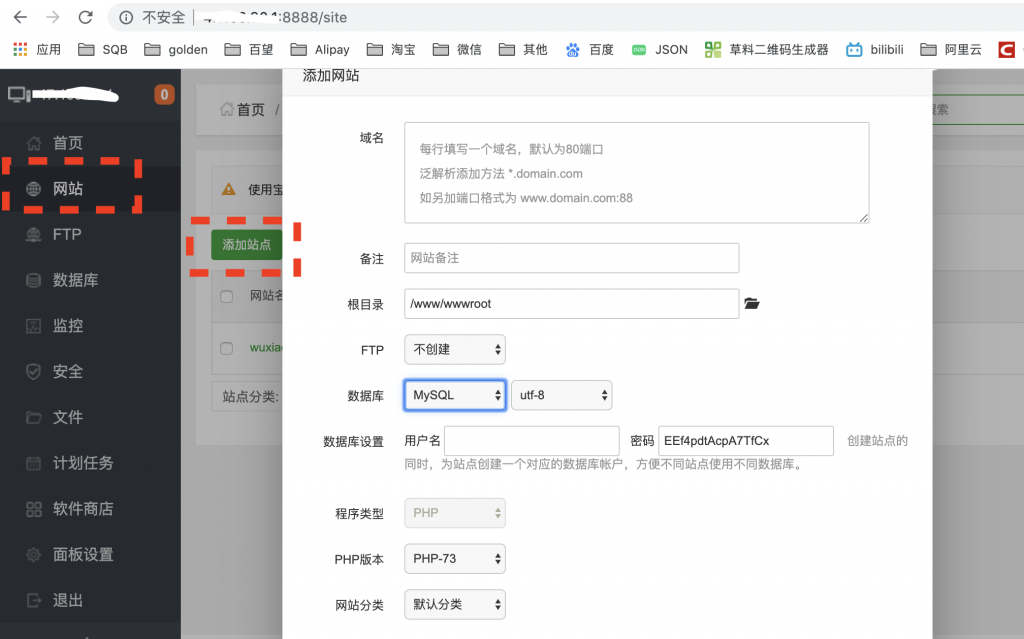 在宝塔面板的:网站-添加站点中,添加一个自己的网站,参考,域名:wuxiaolong.tech或填写轻量服务器的外网IP;备注:我的第一个网站;根目录:使用默认值;FTP:可不创建;数据库:mysql,utf-8;数据库用户名和密码:自定义并且需要自己记住;其他可以默认;创建完成后就可以通过填入的域名或者IP访问我们的网站了;