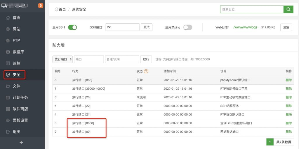 配置宝塔面板-安全-中的端口,需要开放80端口等,可以根据自己的情况开通。